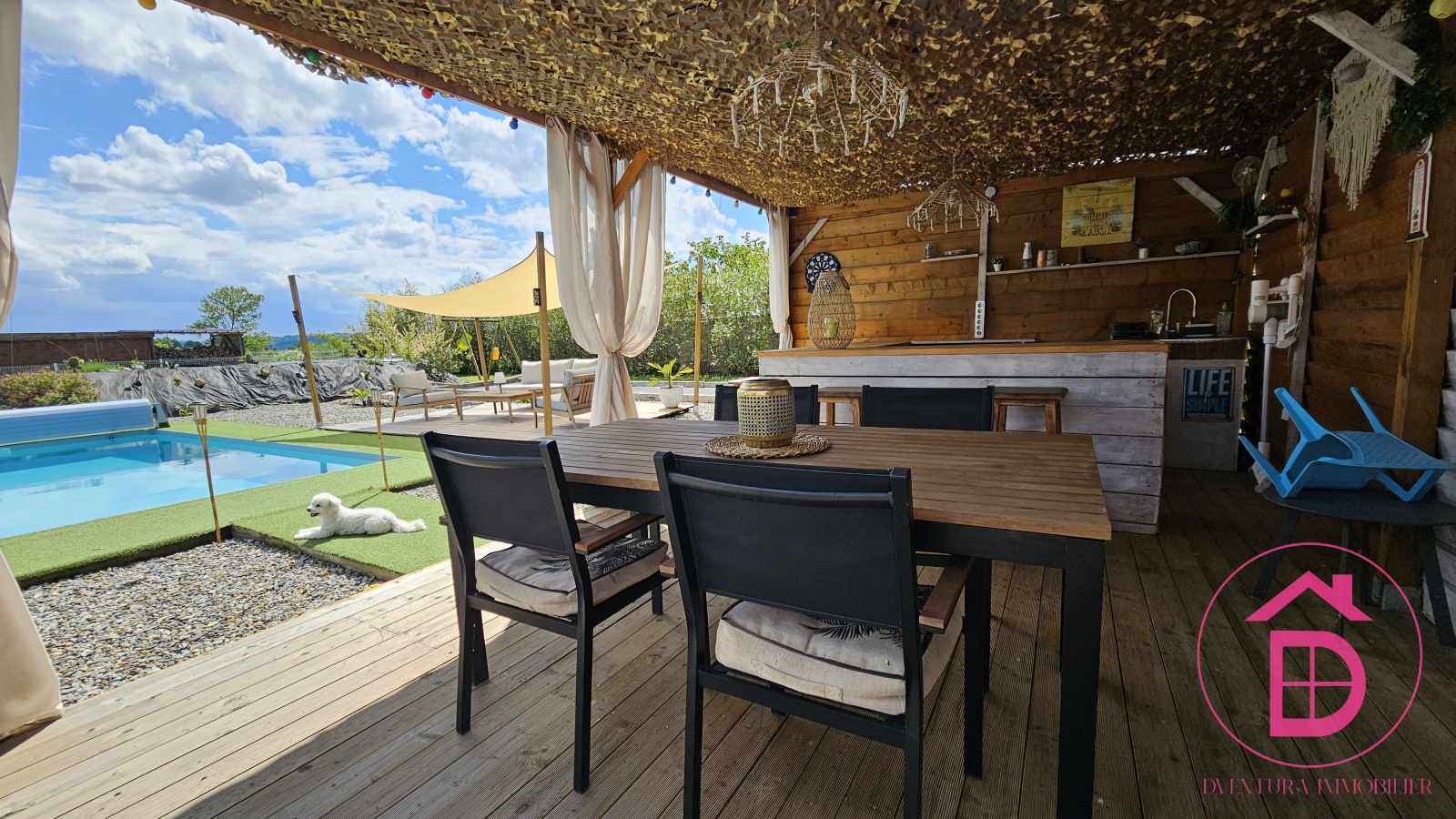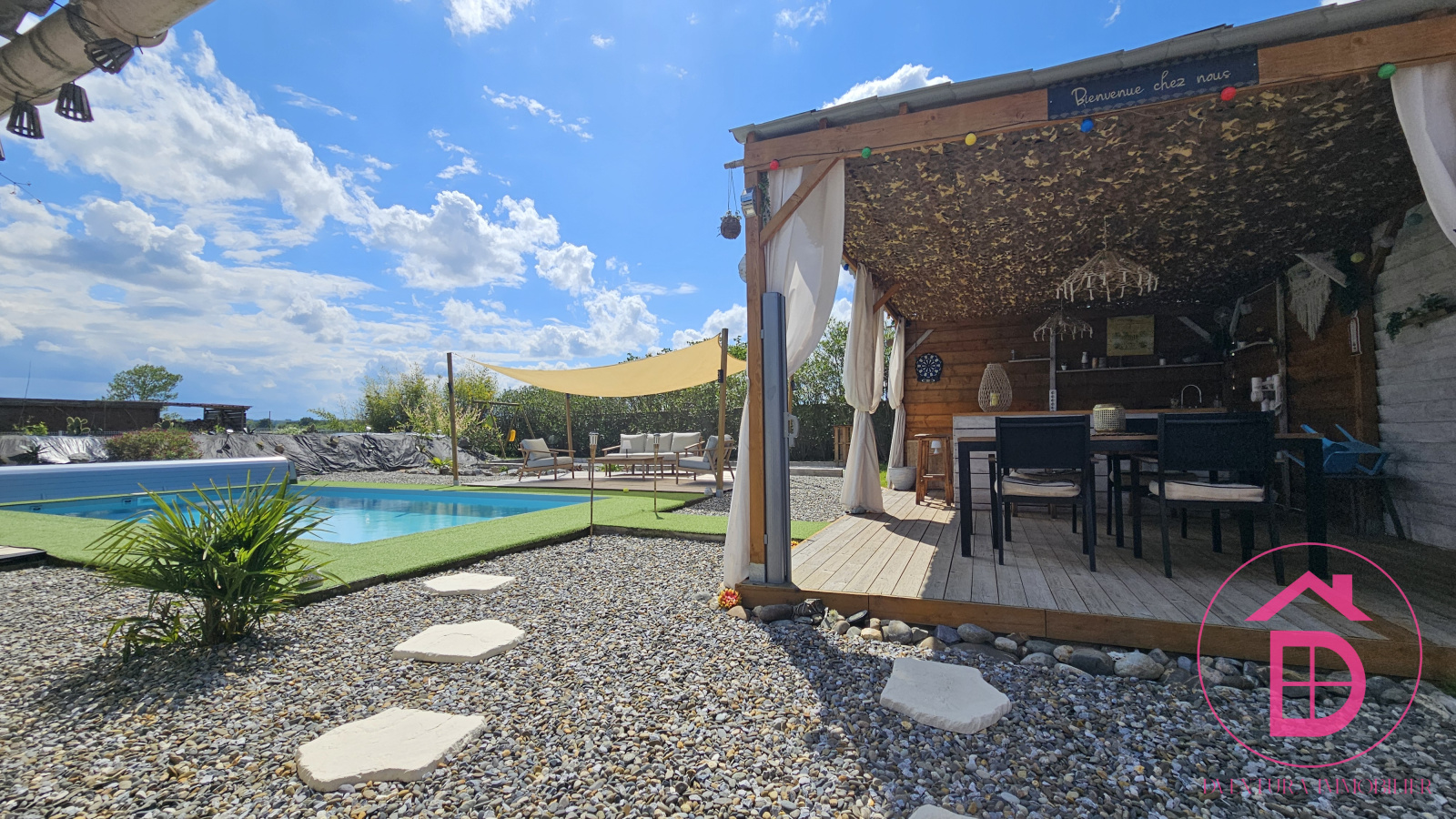 Rien ne manque dans ce bien rare : une piscine au sel avec rideau, un pool house, un boulodrome, un potager, du jardin.